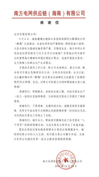 近日,南方电网供应链(海南)有限公司发来感谢信,对远东电缆在关键时刻伸出援手表示衷心感谢,并期待在未来能够与远东电缆深化合作,共同为国民基础供应服务提供更加坚强有力的物资保障。