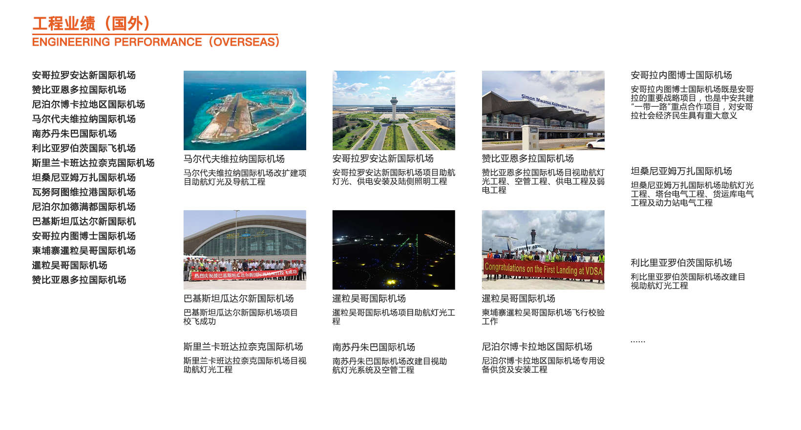 上海浦东国际机场第一至第五跑道助航灯光工程,机场站坪照明工程及围界安防工程,累计合同额7.28亿元人民币。